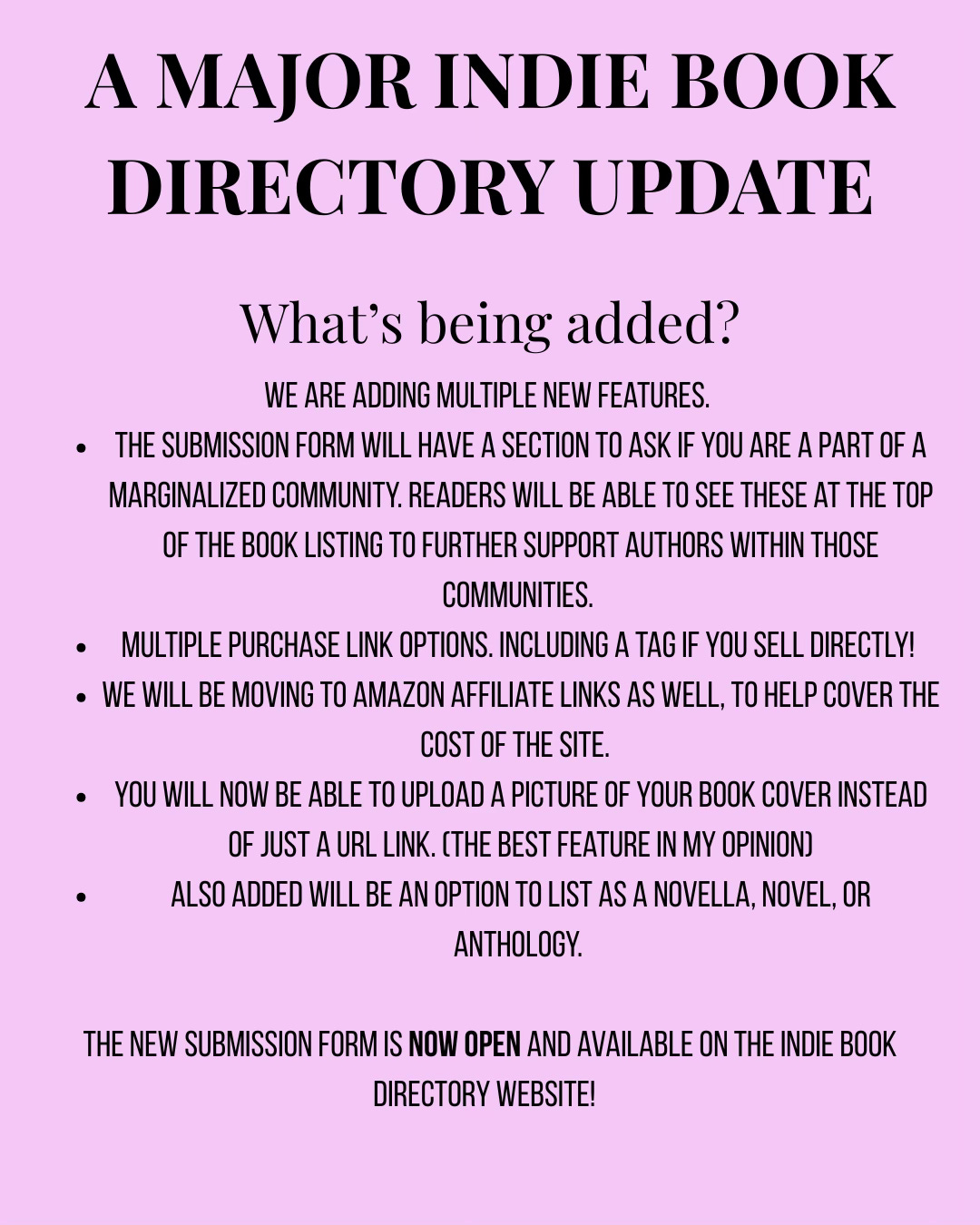 Last week ended in chaos. Between a massive change in the directory website and numerous personal issues, I am finally rested enough to bring in a lengthy update. There will be no social media stats post this week, as last week was a mess, and those numbers don’t reflect anything good. So buckle up and get ready for this massive update. Don’t forget to give a click to your favorite place in the world, the Indie Book Directory!